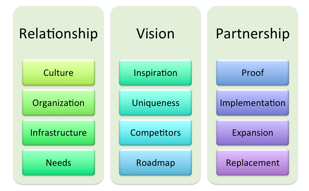 Transport yourself a couple of months (!) from that first opportunity to meet a potential customer and you’ve got a chance to really start to sell a product. For most product people, this is about deployment but to an enterprise account manager this last phase is about building a partnership. There is a distinction. The goal is to become long term partners and the tactic is to get the software into deployment and usage, not the other way around.