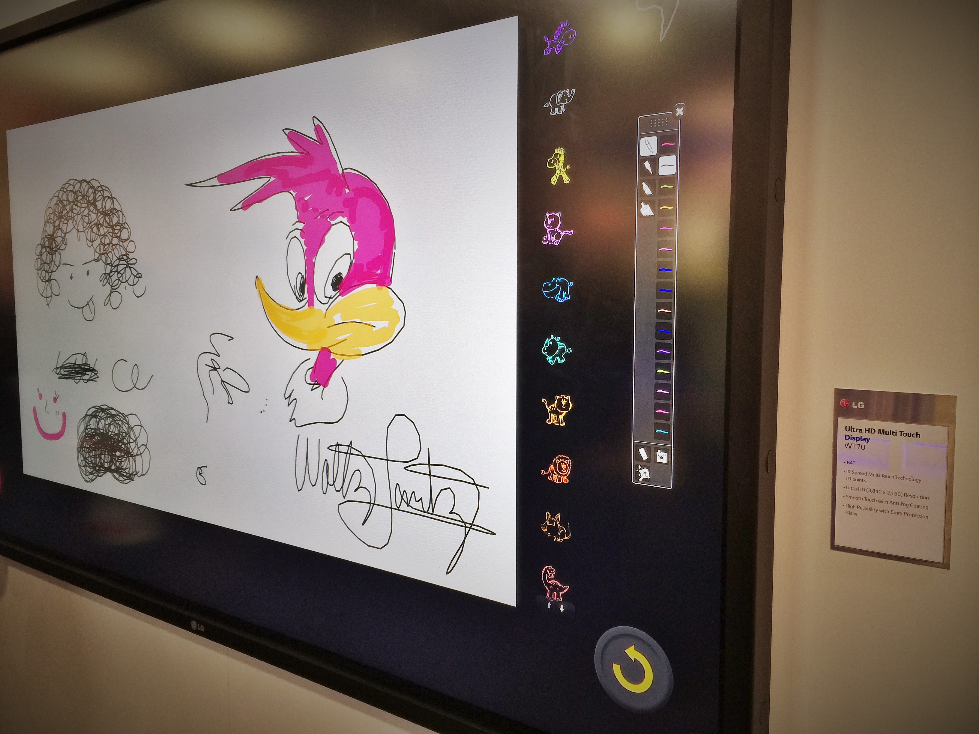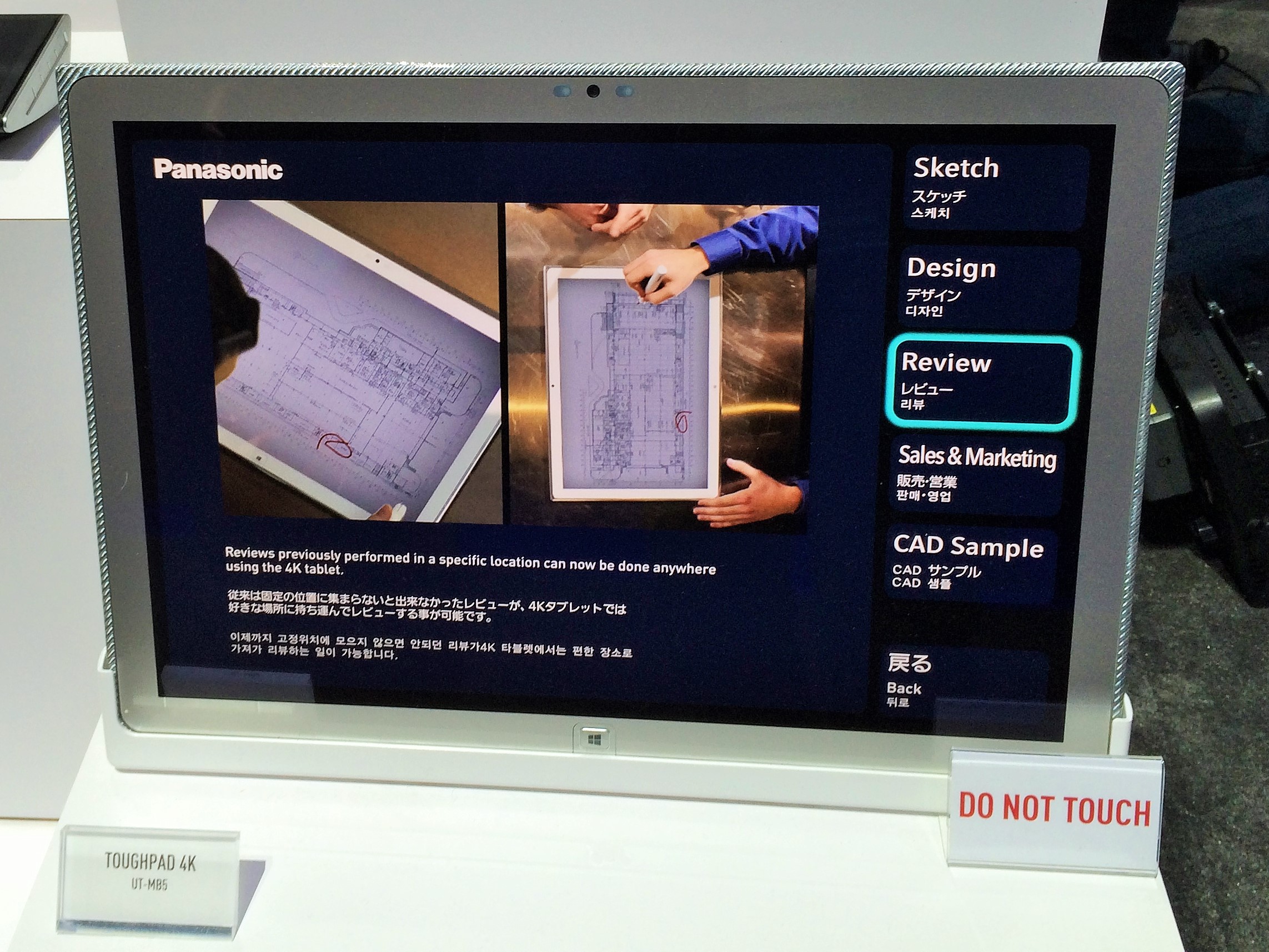 Touch screens. All the major screen makers also showed screens that were touch capable. The most common touch detector was an IR field. All of these were hooked up to PCs. Every screen is a touchscreen or it feels broken. Also pictured below is Panasonic’s 4K portable running Windows.